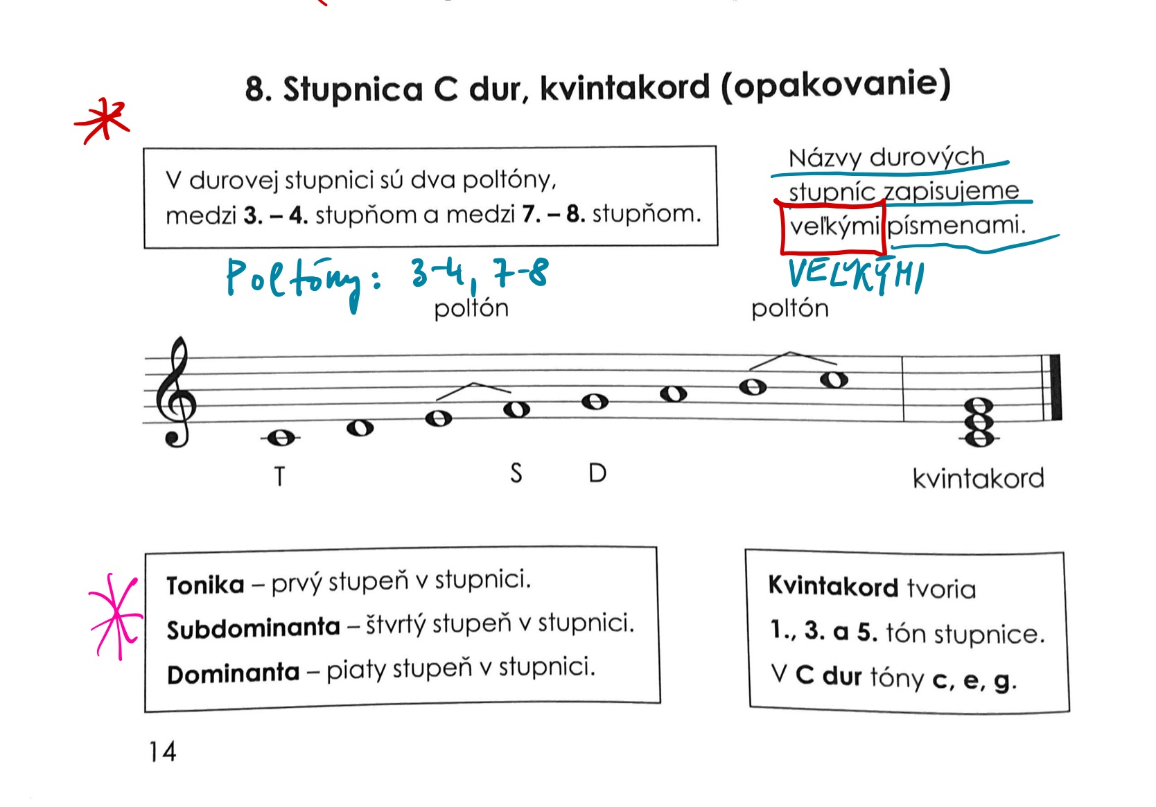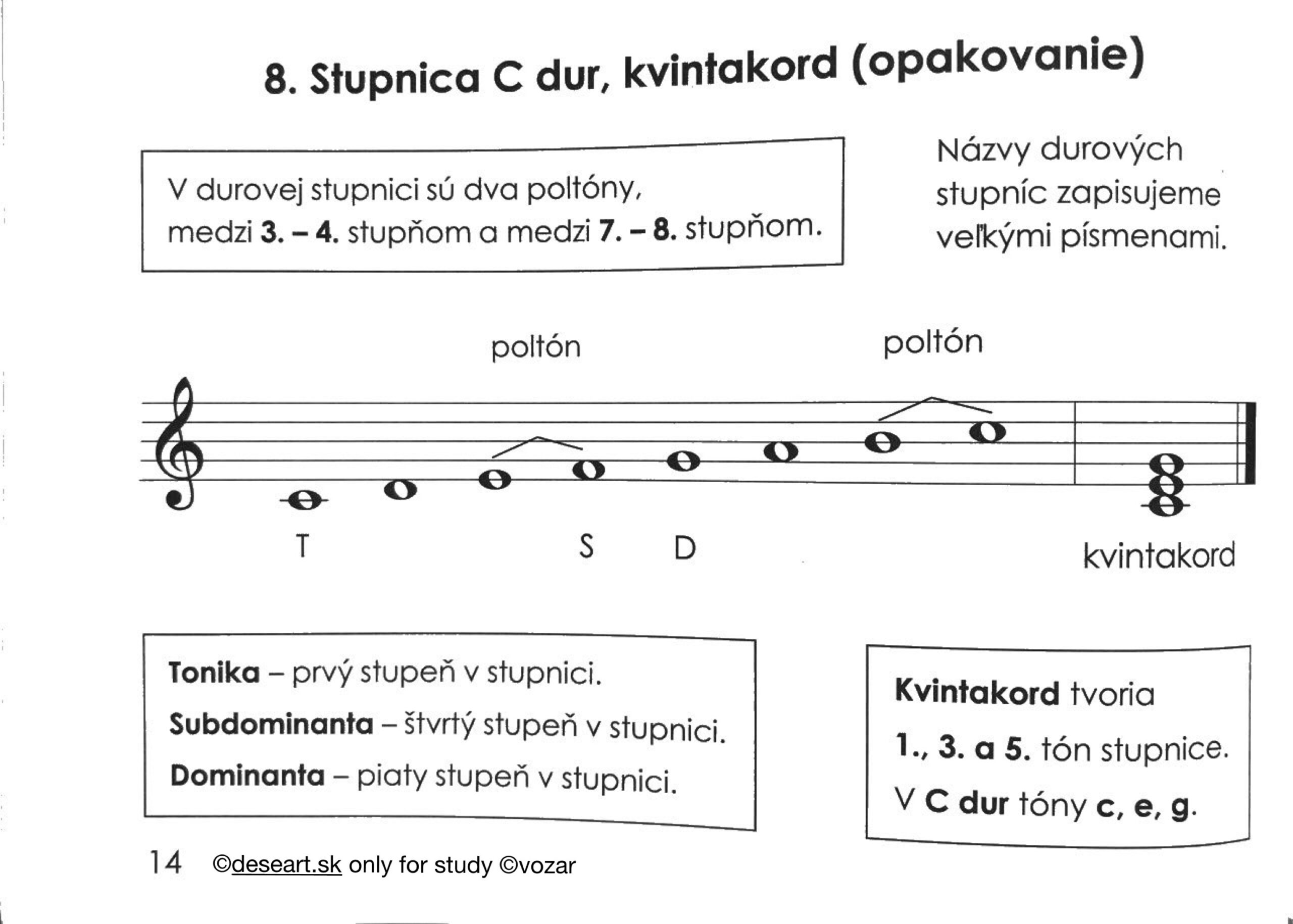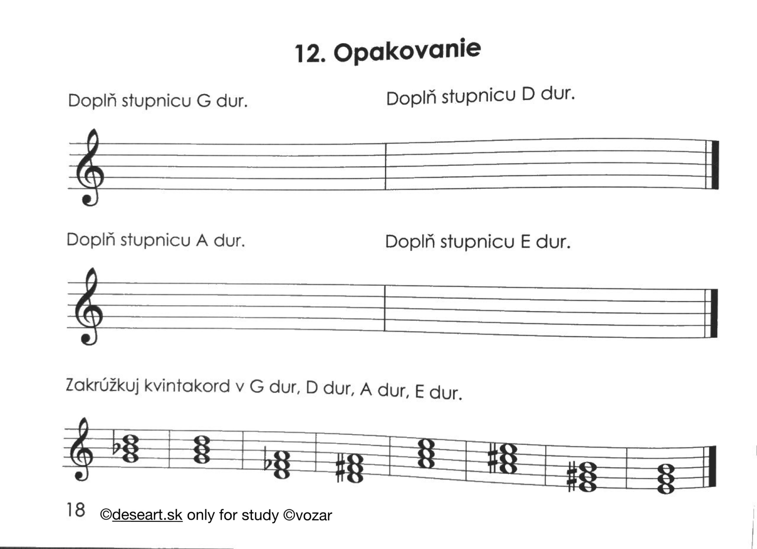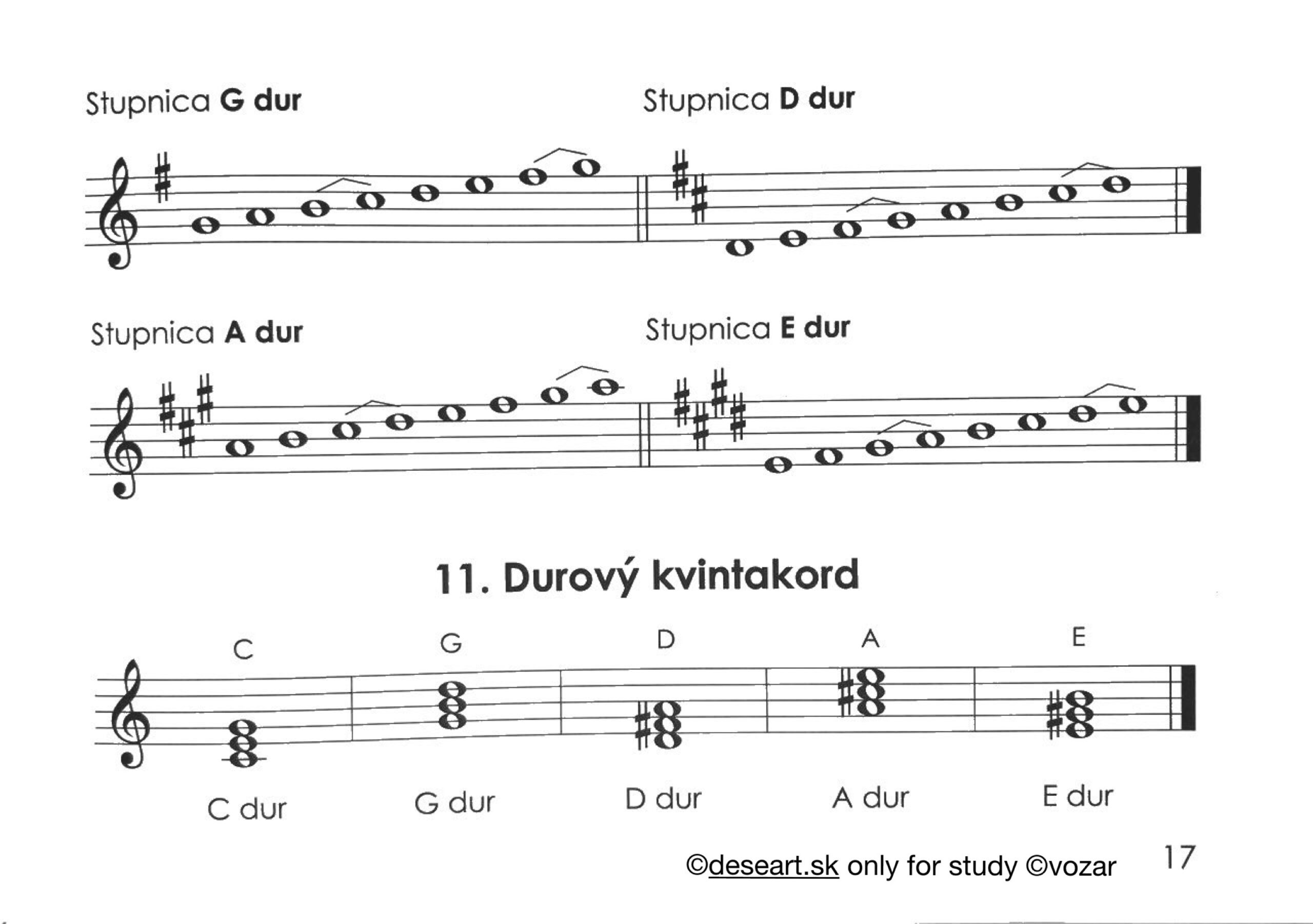 Kap. 37 a 38 – Durové stupnice do 4 béčok a akordy, opakovanie intervalov od tónov: C, D, E, F, G, A H |