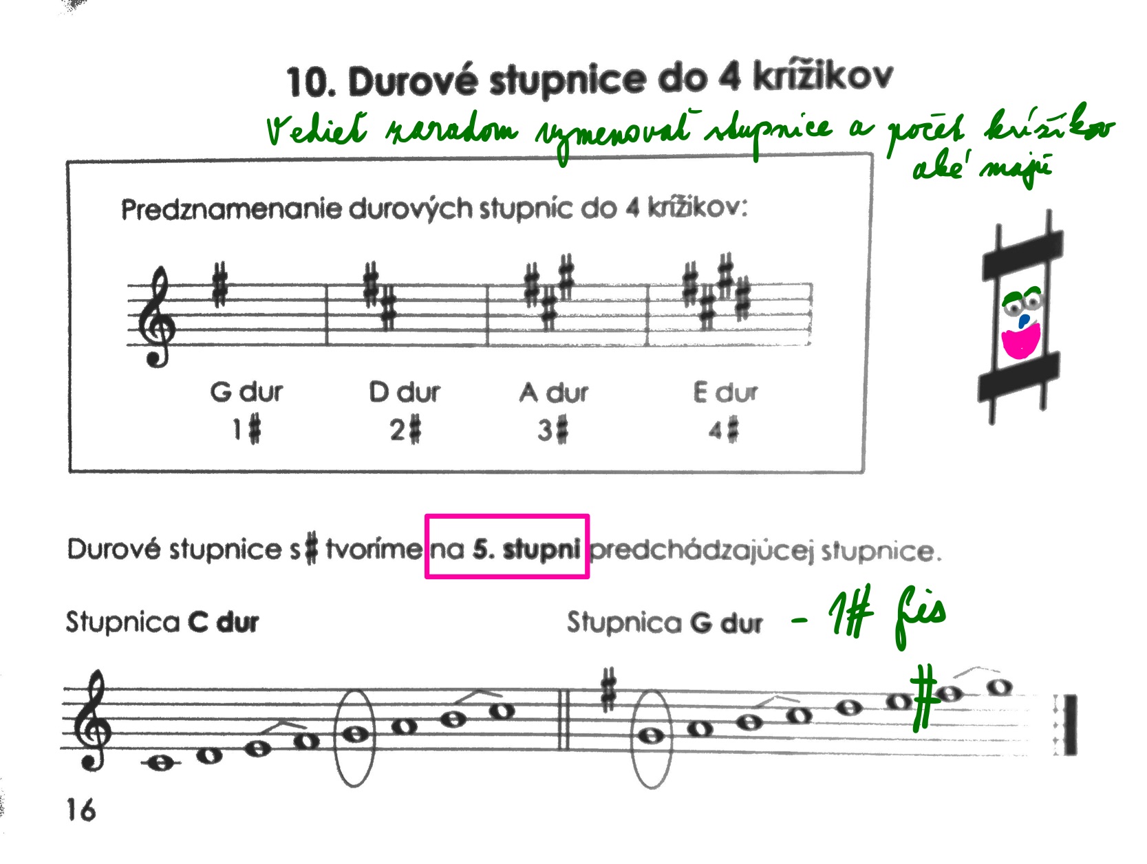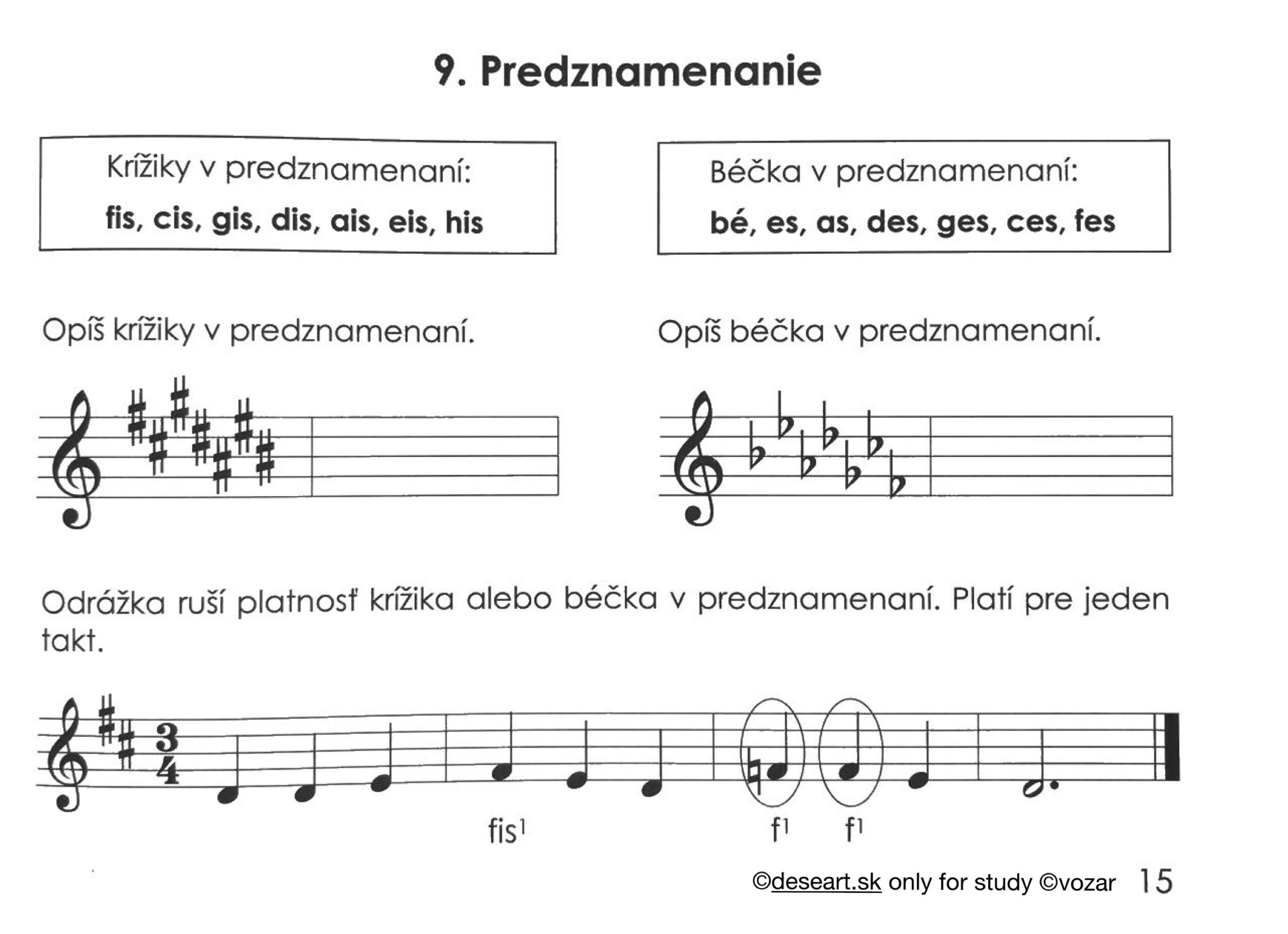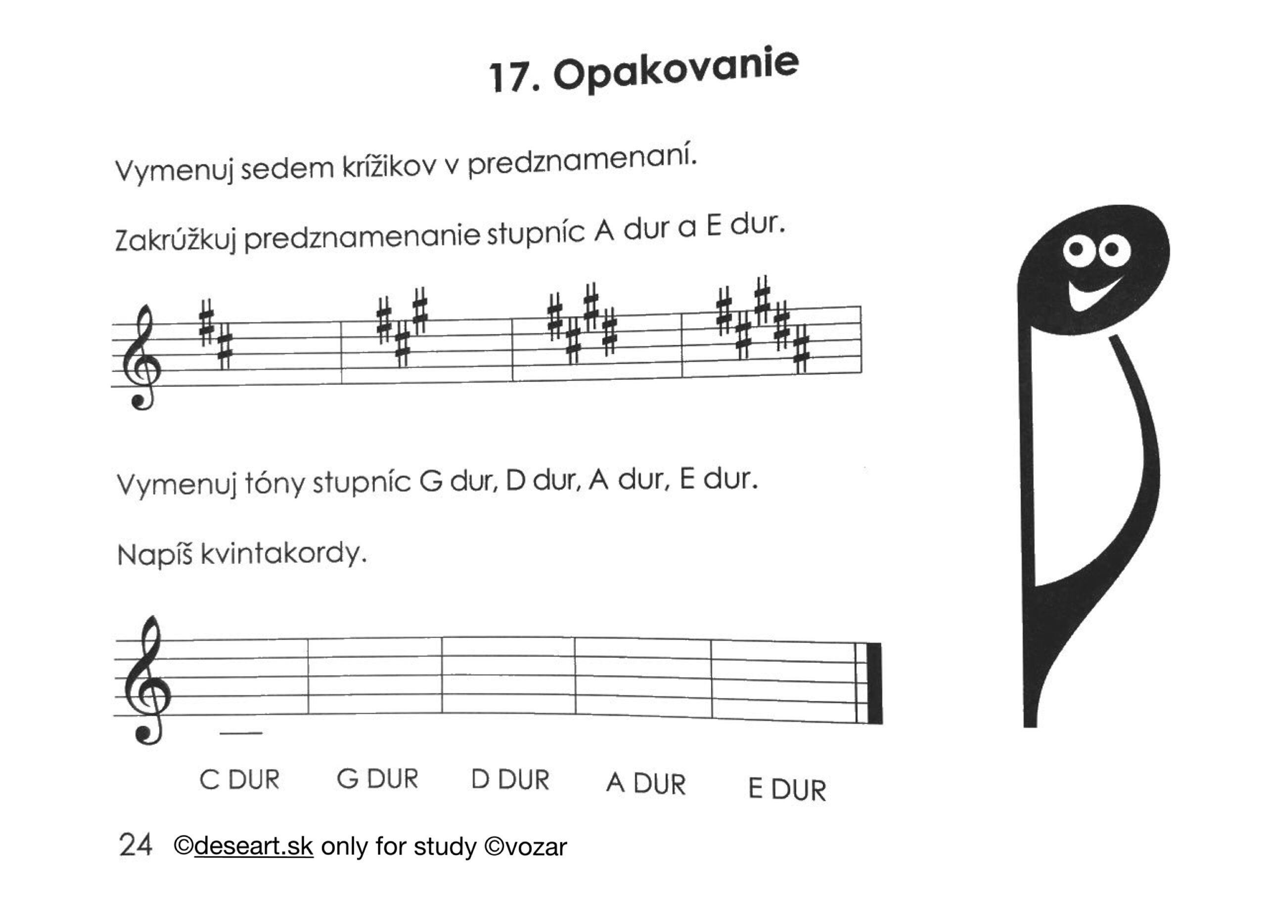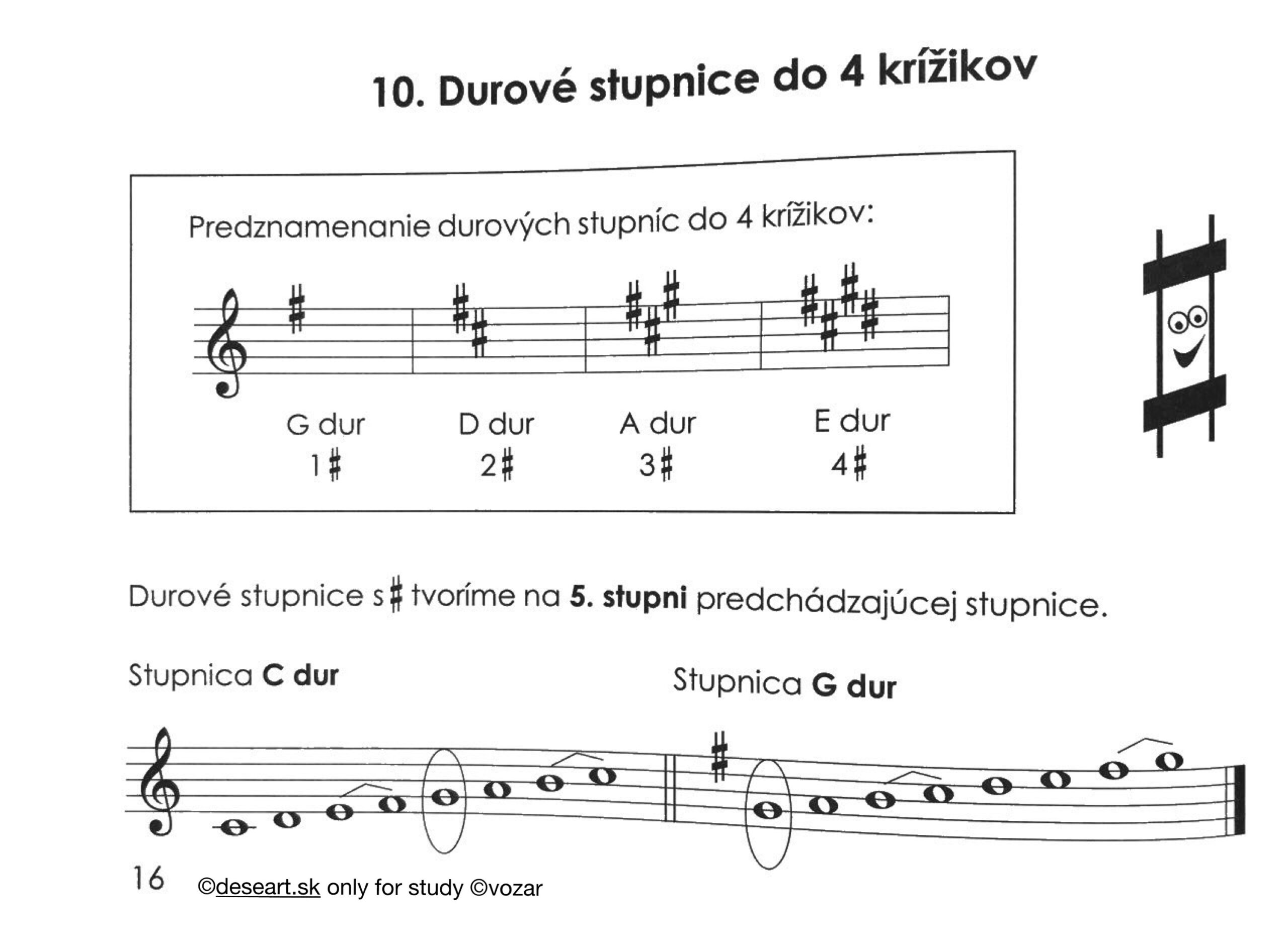 Učivo a úloha z 21. 10. – Kapitola 9, 10 a 11. Vedieť vymenovať krížiky a béčka, vedieť vymenovať durové stupnice do 4 krížikov a počet predznamenaní aké majú.