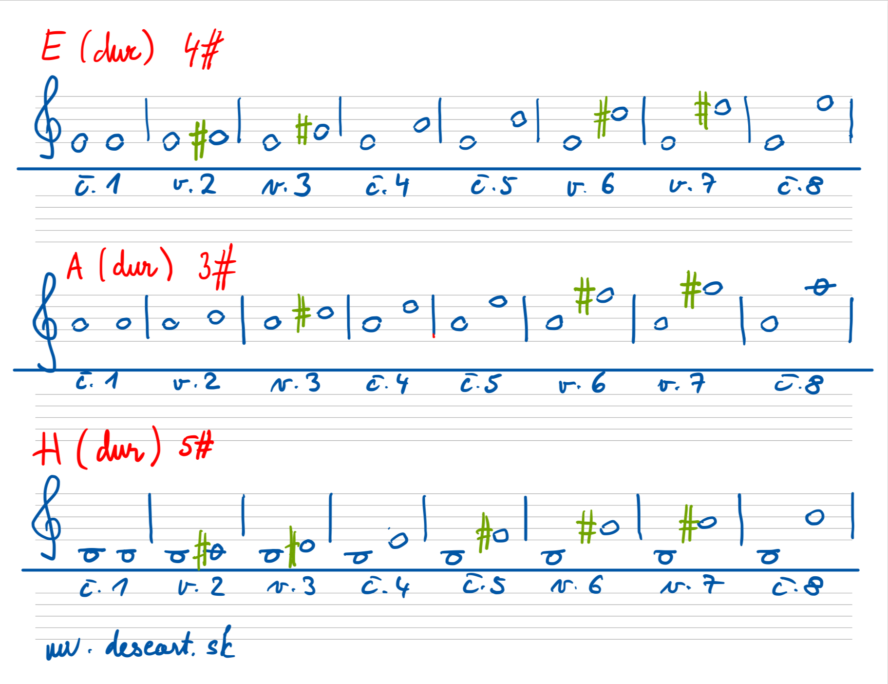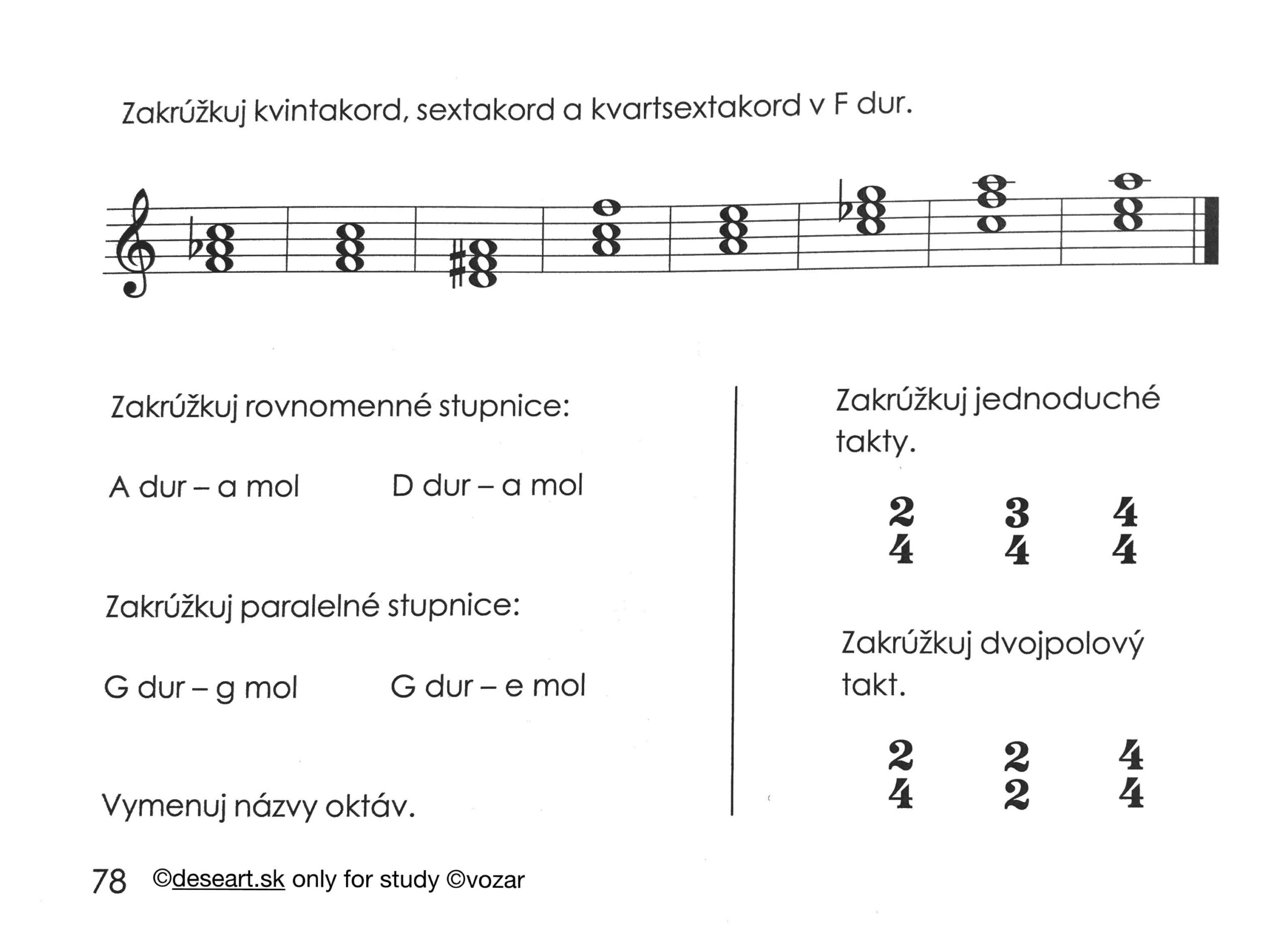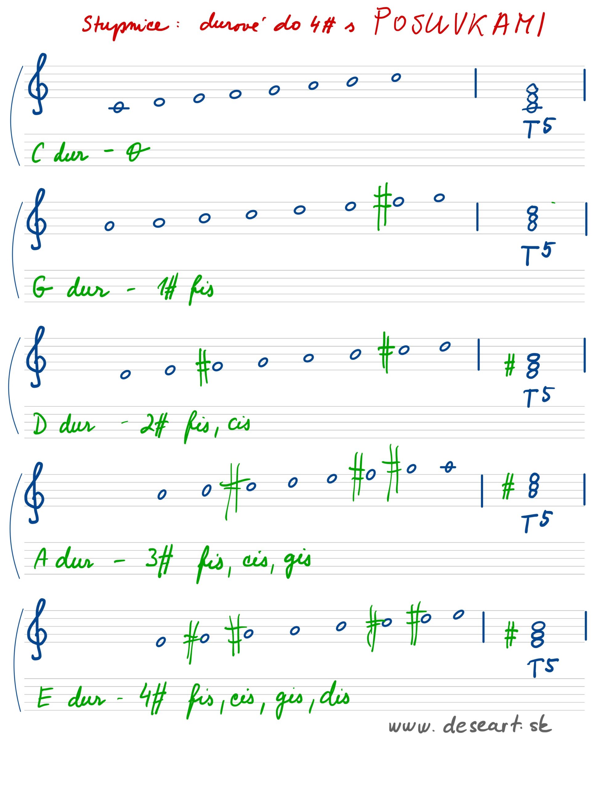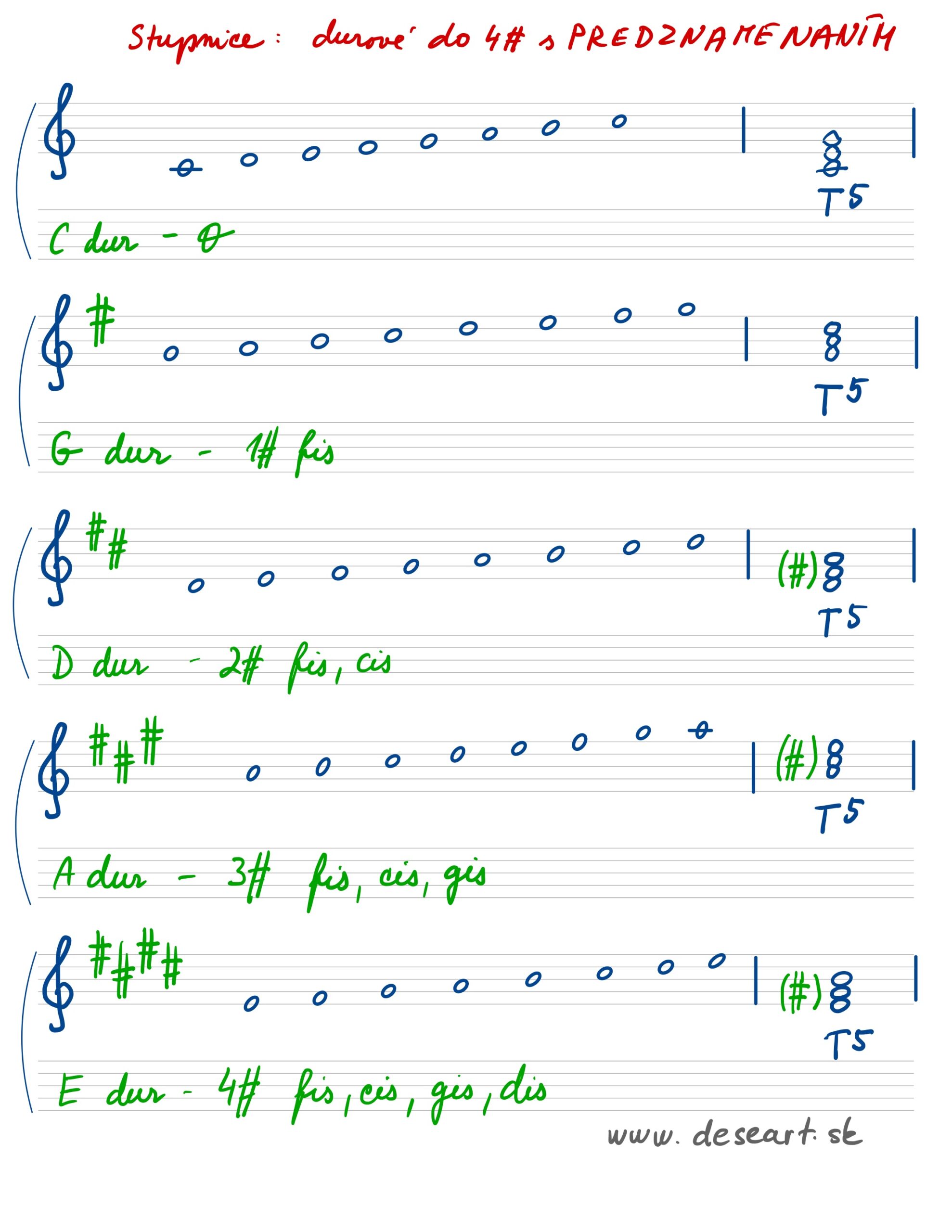 Vedieť napísať stupnice C dur až E dur s posuvkami (napísať akord a TSD), podľa prvého obrázka