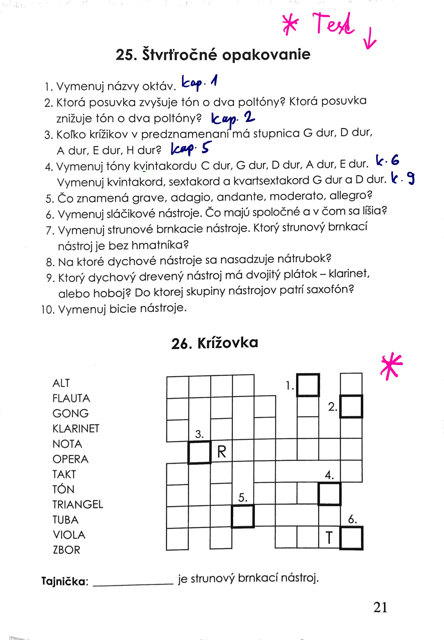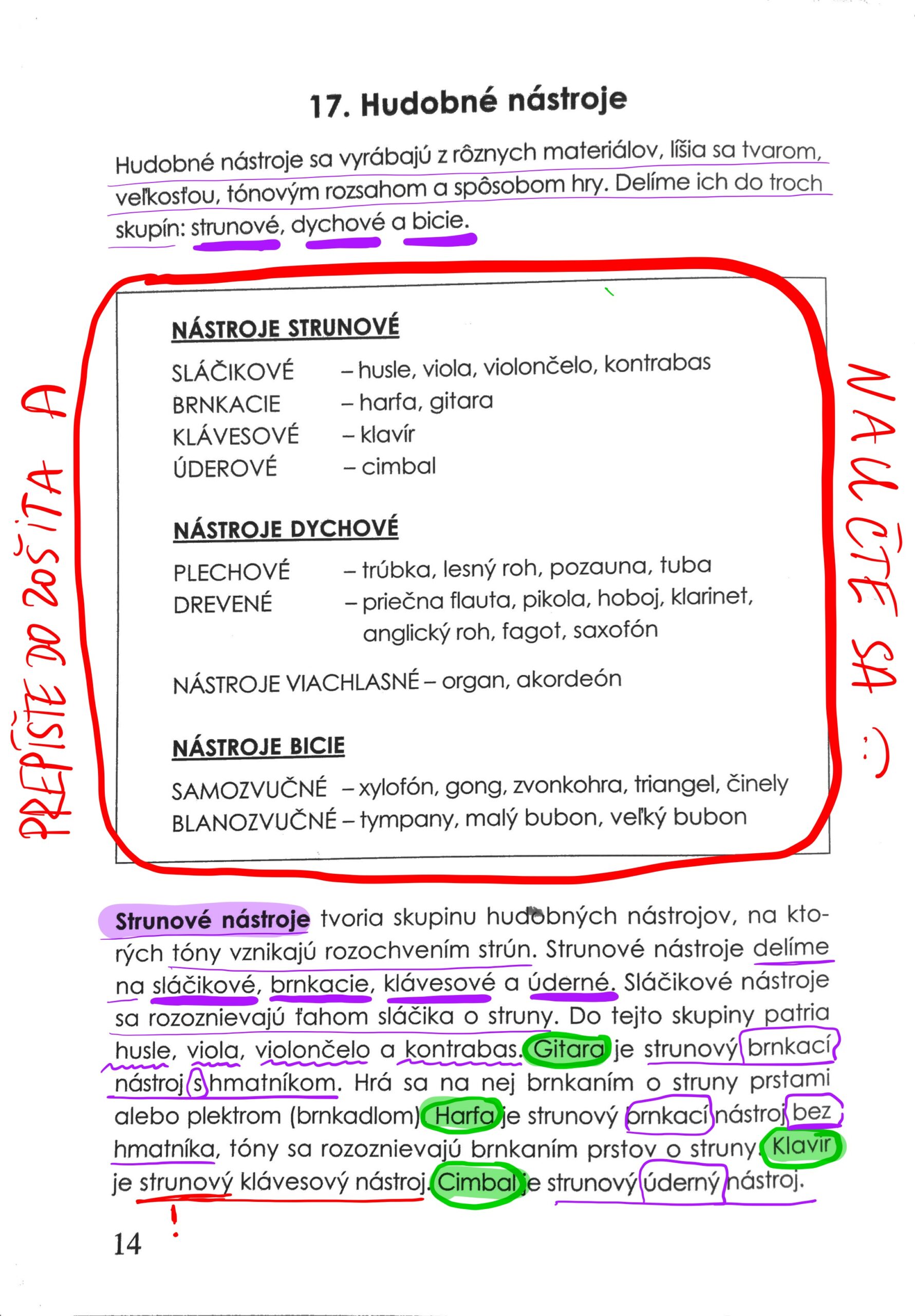 Vedieť zo s. 14 rozdelenie nástrojov (červeným zakrúžkované). Úloha z minula: kap. 14 Označenie tempa – test
